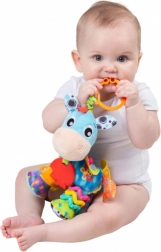 Šustící ouška, cinkající kroužky, chrastící nožička a skrytý motýlek pod sedlem rozvíjejí zvědavost a motoriku.