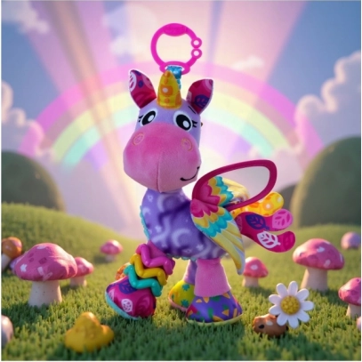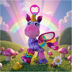 Hledáte smyslovou hračku, která vaše miminko zaujme na první dotek i pohled? Jednorožec Stella kombinuje měkké plyšové materiály, šustící křídla, cinkající kroužky a bezpečné zrcátko na křídle. Lesklý roh, stříbrné křídlo a vrstvený ocas podporují zvídavé objevování a jemnou motoriku.