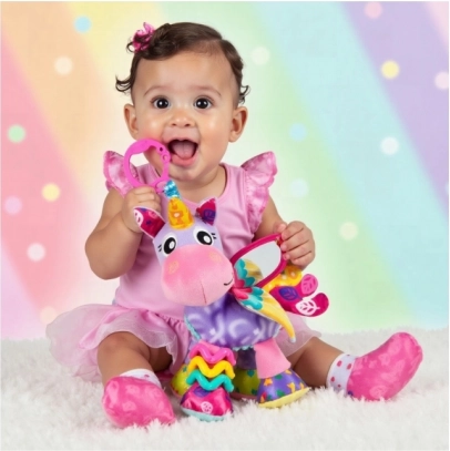 Roztomilý jednorožec Stella od Playgro je měkoučká závěsná hračka pro nejmenší, která podporuje rozvoj smyslů a zabaví na cestách i doma. Nabízí zrcátko pro sebeobjevování, šustící a cinkající prvky, různé textury a kontrastní vzory pro stimulaci zraku, hmatu i sluchu. Díky praktickému C klipu ji snadno připevníte na kočárek, autosedačku či postýlku.