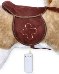 • V bříšku je bezpečně ukrytý bateriový modul. Po vložení 2× AA (nejsou součástí balení) koník vydává zvuky:
