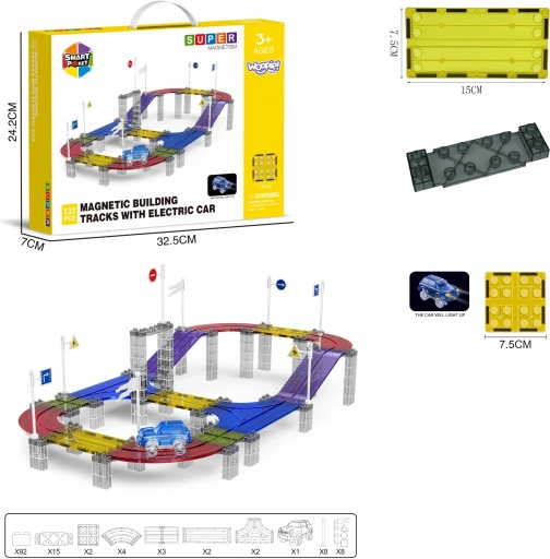 Woopie magnetická závodní dráha s LED autíčkem, 137 dílů. Snadné spojování, víceúrovňové tratě, světelné efekty. Kreativní zábava pro děti od 3 let.