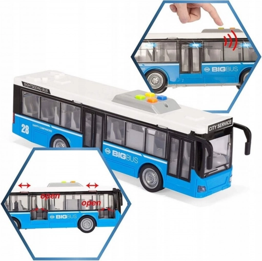 Objevte skvěle zpracovaný městský autobus WOOPIE ve škále 1:16, který děti nadchne autentickými detaily i funkcemi. Stačí stisknout jeden ze čtyř tlačítek na střeše a autobus se ozve jako opravdový: start motoru, jízda, couvání i klakson. Interiér je podsvícený a dveře se otevírají a zavírají ručně pomocí praktického otočného ovladače.