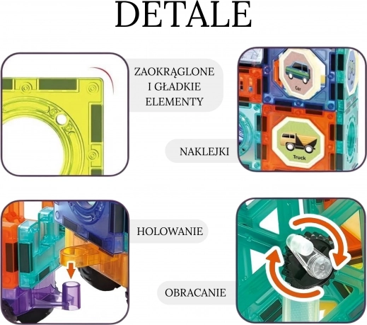 Součástí balení jsou také samolepky s dopravními prostředky a 2 podvozky s koly pro tvorbu aut, autobusů či náklaďáků. Všechny dílky mají hladké, zaoblené hrany pro bezpečné hraní a jsou navrženy s důrazem na detail.