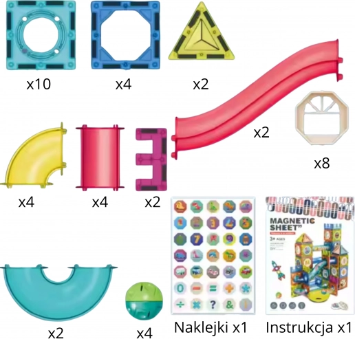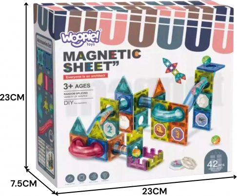 Sestava obsahuje 42 komponentů včetně magnetických dlaždic a tvarovaných sekcí dráhy, díky nimž lze vytvářet rozmanité, stabilní a zábavné konstrukce. Díly se k sobě snadno a pevně přichytí pomocí výkonných magnetů, takže zvládnou i odvážnější projekty.