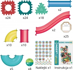 Velká sada 128 kusů nabízí širokou škálu tvarů a barev pro tvorbu jednoduchých i pokročilých projektů. Průhledné prvky umožňují sledovat pohyb kuliček a přirozeně vysvětlují zákony rychlosti, gravitace a setrvačnosti. Hra rozvíjí kreativitu, trpělivost i technické dovednosti.