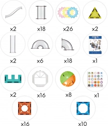 - Magnetické dílky, prvky dráhy (rampy, zatáčky, trubice), kuličky, návody