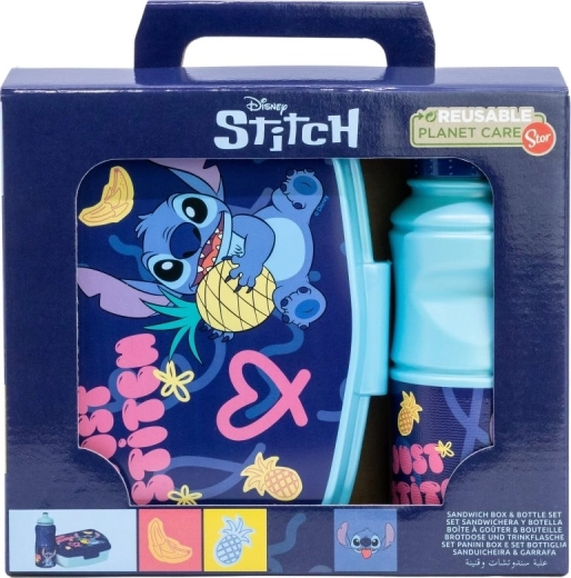 Tato jídelní sada potěší všechny malé fanoušky STITCH. Lehké a pevné provedení zajistí pohodlné nošení v batohu a snadnou manipulaci během dne. Láhev o objemu 380 ml je ideální pro vodu či džus, svačinový box udrží sendviče a ovoce pěkně pohromadě.