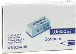 Praktická bílá pryž WEIBO je nezbytnou pomůckou do školy i kanceláře. Z kvalitního, měkkého materiálu zajišťuje čisté a účinné mazání bez rozmazávání a nepoškozuje papír. Díky kompaktním rozměrům 3,5 × 2 × 1 cm se vejde do každého penálu či šuplíku a neobsahuje latex.