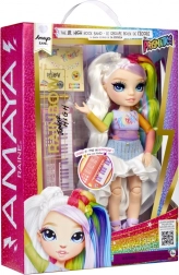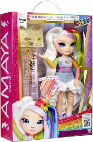 Amaya Raine ze série Rainbow High Jr. High přináší dětem svět módy a hudby v jedné roztomilé panence. Díky dlouhým duhovým vlasům, detailnímu oblečku a kloubům je připravená na koncerty, focení i vystavení na poličce. Doplňky včetně mini kláves podpoří hraní na hudební hvězdu.