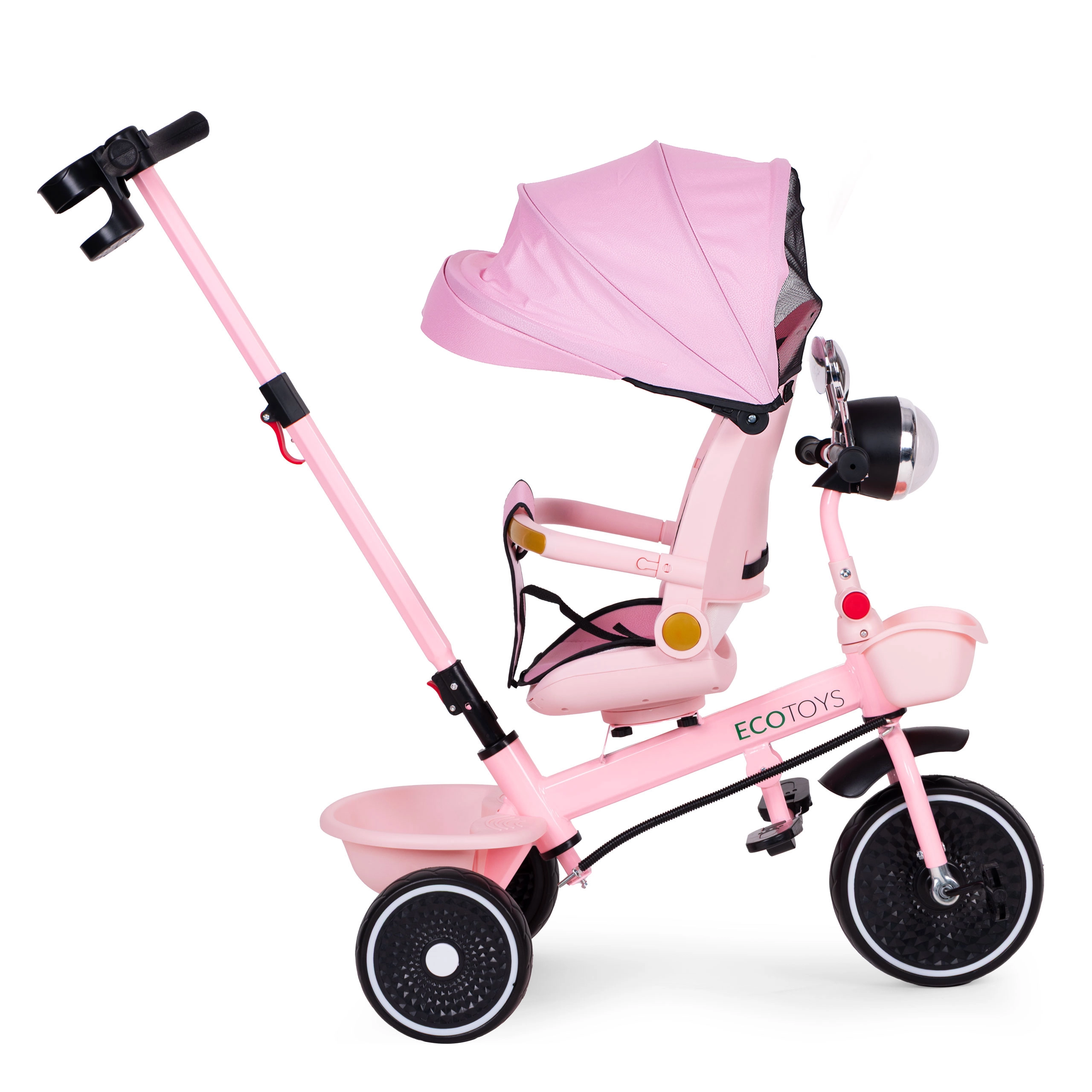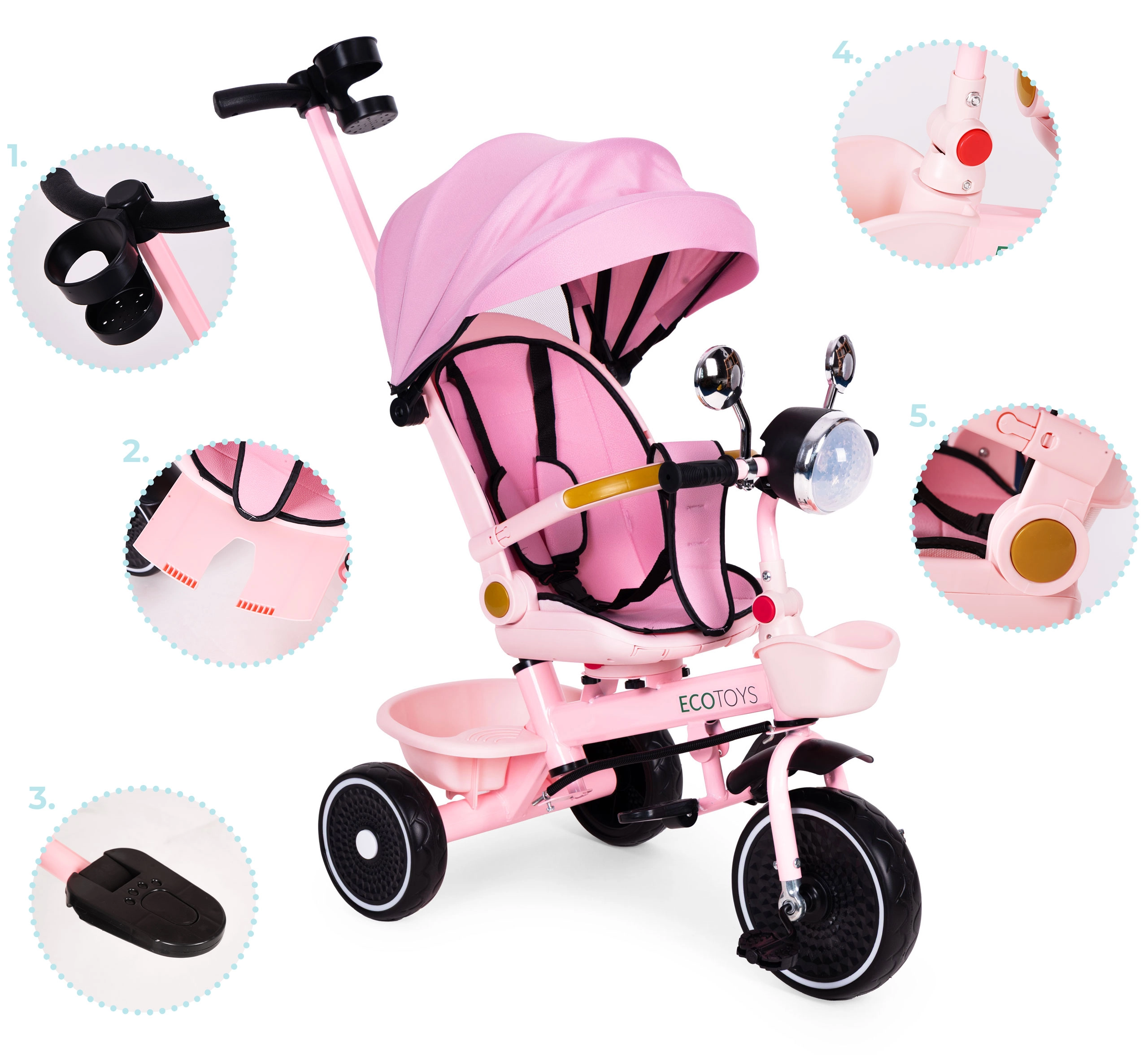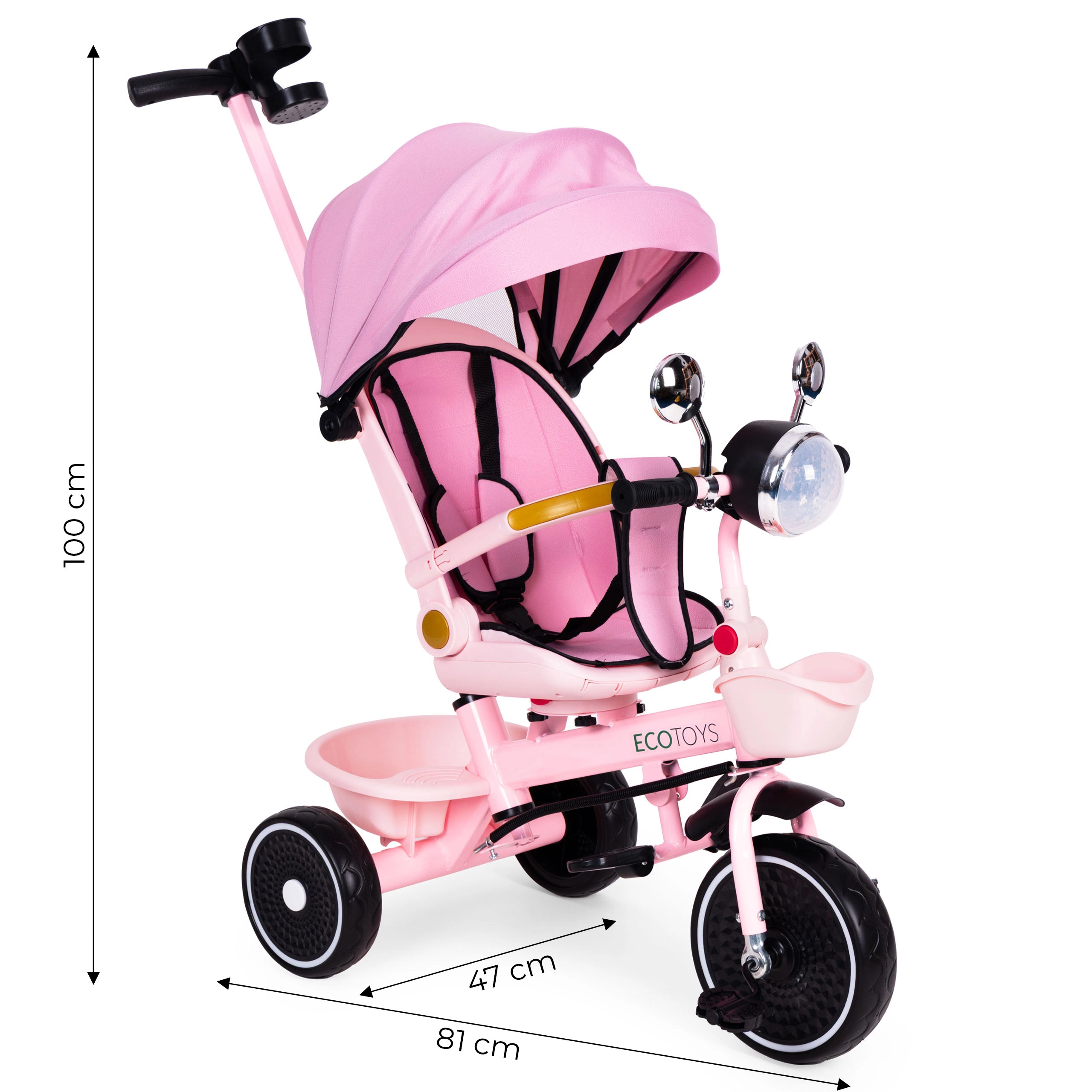 Stylový růžový tříkolový kočárek ECOTOYS spojuje pohodlí kočárku a radost z jízdy na tříkolce. Nabízí otočné sedadlo o 360°, rodičovskou vodicí tyč se řízením předního kola, skládací stříšku, pětibodový bezpečnostní pás a odolná EVA kola pro hladkou a bezpečnou jízdu od 6 měsíců do 6 let.