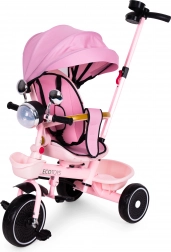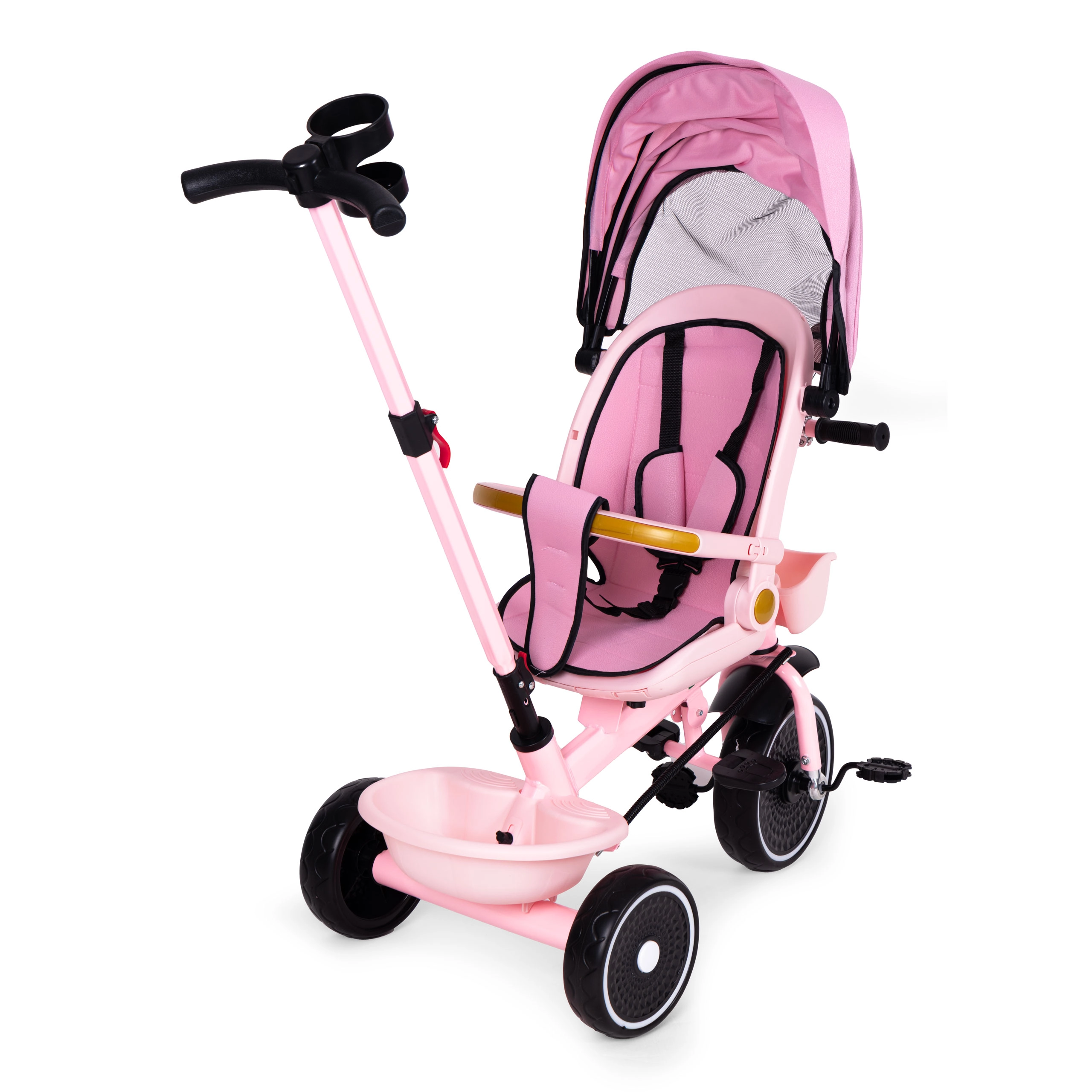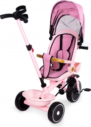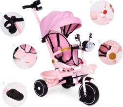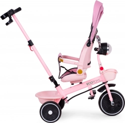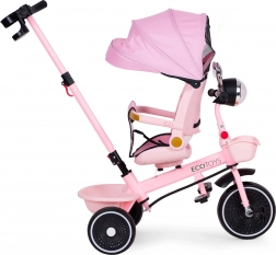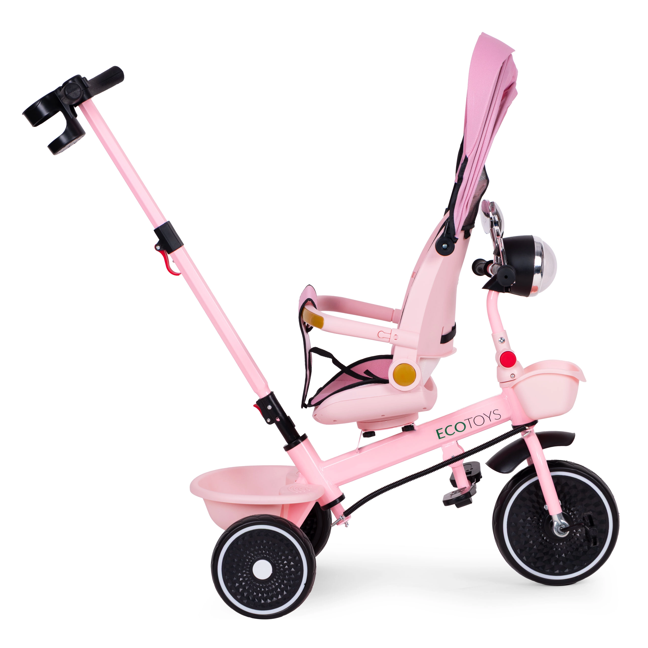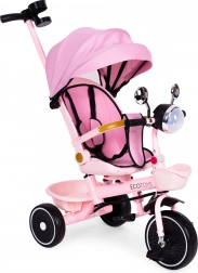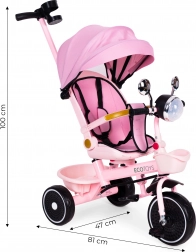 Stylový růžový tříkolový kočárek ECOTOYS spojuje pohodlí kočárku a radost z jízdy na tříkolce. Nabízí otočné sedadlo o 360°, rodičovskou vodicí tyč se řízením předního kola, skládací stříšku, pětibodový bezpečnostní pás a odolná EVA kola pro hladkou a bezpečnou jízdu od 6 měsíců do 6 let.