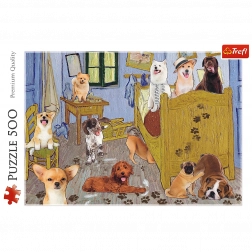Objevte zábavné puzzle Trefl s motivem Pokoj VAN GOGHA: Psí revoluce. Skládačka o 500 dílcích nabízí originální, humorné ztvárnění slavného obrazu a potěší milovníky psů. Hotový obraz má rozměry 48 × 34 cm a díky kalandrovanému, lesk odrážejícímu papíru se dílky snadno skládají. Vyrobeno v Polsku z kvalitních materiálů s ohledem na životní prostředí.