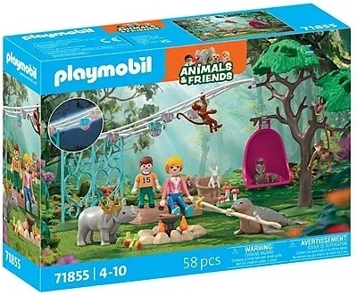Malý nosorožec slaví narozeniny a všichni jsou zváni! Foka připravuje nad ohněm lahodná pečená jablka, králíček si dává pauzu po veselých závodech a hosté se scházejí pod girlandou, která svítí ve tmě. Set PLAYMOBIL přináší spoustu možností pro kreativní hru ve dne i v noci.
