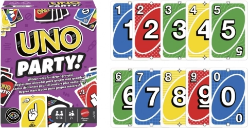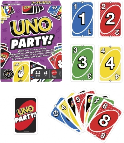 Zažijte ještě víc zábavy s karetní hrou UNO Party – speciální edicí pro větší skupiny. Hraje se jako klasické UNO, ale s více kartami, novými interaktivními pravidly a bláznivou párty atmosférou. Křičte „UNO!“, když vám zbývá poslední karta, a užijte si akční momenty se speciální kartou „Ukaž na druhého“.