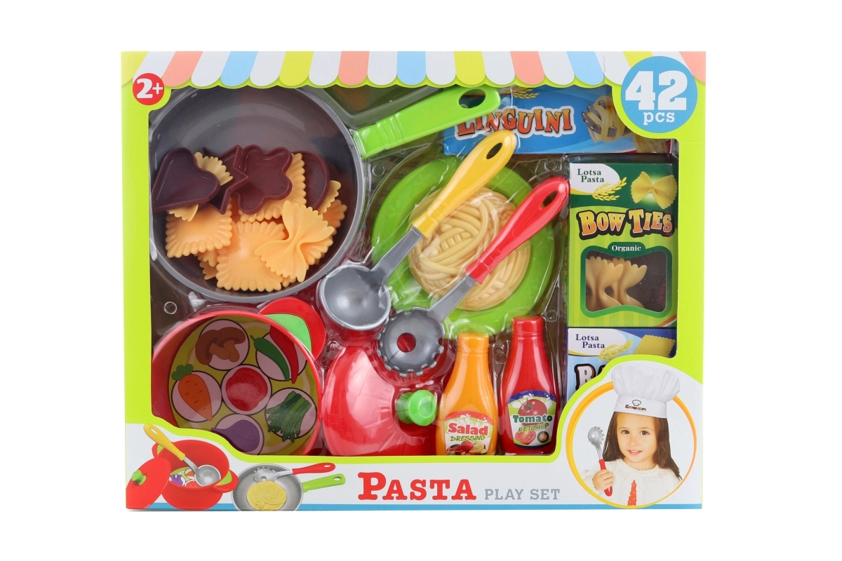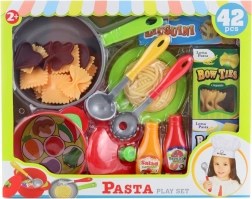 Zábavná plastová kuchyňská sada pro malé kuchaře od 2 let. Obsahuje hrnec s pokličkou, pánev, talíř, naběračky, těstoviny a další doplňky pro kreativní hraní. Podporuje rozvoj jemné motoriky, role-play a zábavu v dětské kuchyňce.