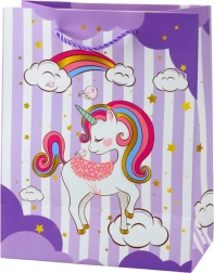 Barevná dárková taška s motivem jednorožce je ideální pro elegantní předání drobných dárků. Nabízí pevný kvalitní papír, stylové šňůrkové ucho a univerzální rozměry 23 × 16 × 10 cm. Díky pohádkovým vzorům s duhou, hvězdičkami a obláčky působí kouzelně a zajistí působivé balení dárku.