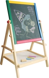 Tato dřevěná, dvoustranná a multifunkční tabule je skvělým pomocníkem pro každodenní hraní i učení. Děti mohou trénovat psaní, kreslení i první počty na magnetické bílé straně se suchým stíráním nebo tvořit křídou na tradiční černé ploše. Díky prostorné poličce mají všechny pomůcky vždy po ruce.