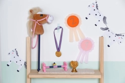 Koník na tyči s plyšovou hlavou, doplňky na trénink a závody, medaile, vítězný pohár