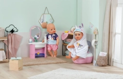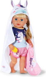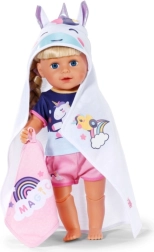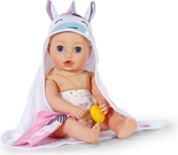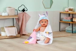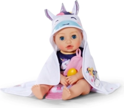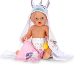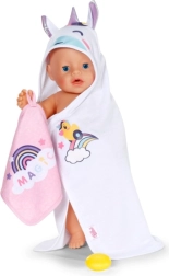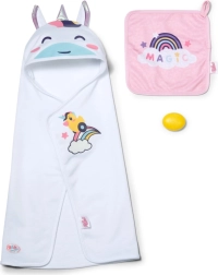 Tato kouzelná sada ručníků BABY born přináší vše, co potřebujete pro zábavné koupací rituály. Dva ručníky s motivem duhy a jednorožce potěší každého malého pečovatele, zatímco kapuce s duhovým rohem a roztomilými oušky dodá každému sušení veselý nádech.