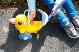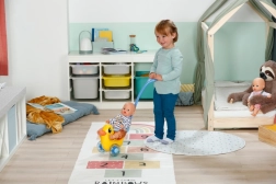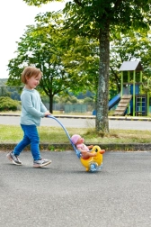 Průhledná chrastící kolečka s korálky dodávají jízdě zábavný zvukový efekt a povzbuzují smyslové vnímání. Pod sedátkem se skrývá tajná přihrádka na drobnosti, díky níž je každá vycházka ještě dobrodružnější. Kvalitní provedení zaručuje dlouhotrvající hru plnou představivosti.