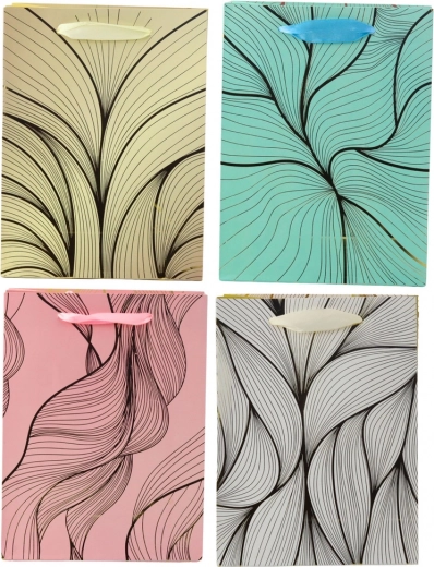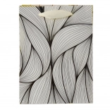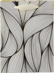 Tato dárková taška zaujme moderním designem a luxusními zlatými liniemi, které na barevném podkladu vytvářejí jemný efekt vln. Díky pevnému zpracování je vhodná i pro těžší dárky a její rozměry se skvěle hodí pro středně velké předměty.