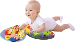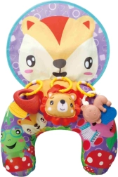 Součástí je šusticí podložka s motivem lišky, která vydává zvuk při dotyku, a tři barevné závěsky, které lze připínat pro rozvoj koordinace ruka–oko a jemné motoriky. Celek spojuje funkci hračky, edukační podložky i pohodlné opory pro bezpečné cvičení.