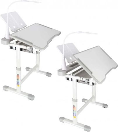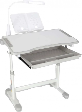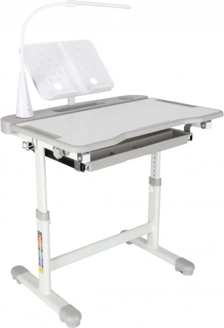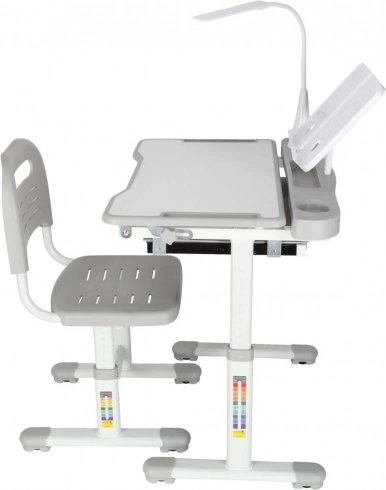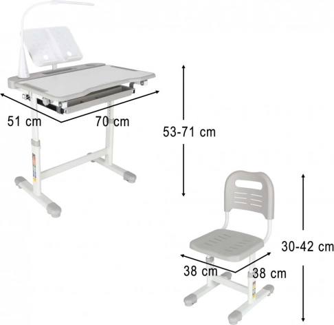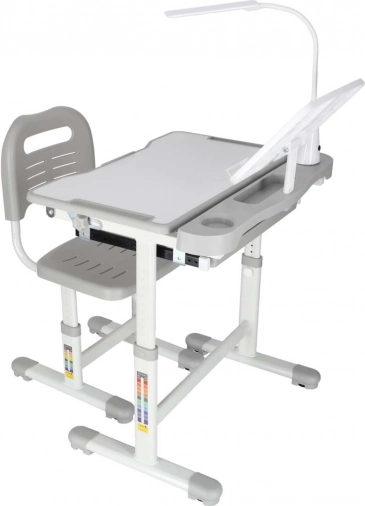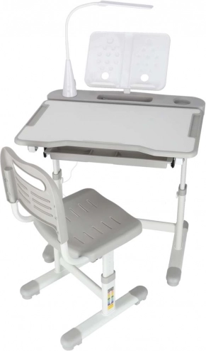 Praktický dětský psací stůl se židlí a USB LED lampou v šedé barvě vytvoří ergonomické a upravené místo pro učení i tvoření. Výšku stolu i židle lze plynule přizpůsobit růstu dítěte, nechybí výklopná pracovní deska, velká zásuvka s organizérem, držák na tašku, místo na kelímek a stojan na knihu. LED lampička nabízí 3 režimy světla a 3 úrovně jasu pro správné osvětlení ve dne i v noci.