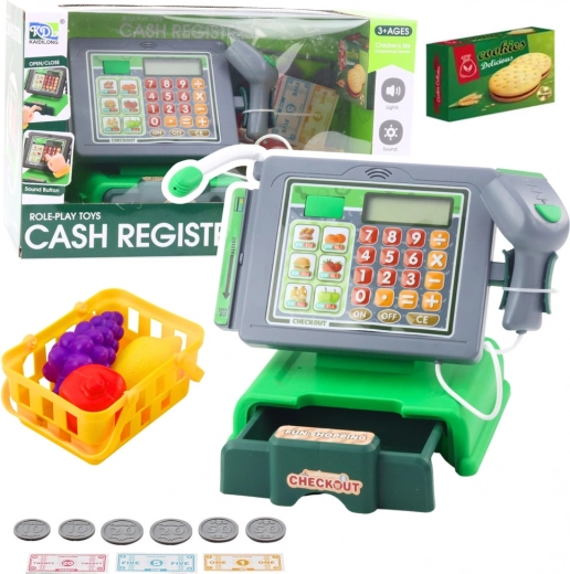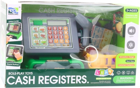 Zábavná a vzdělávací dětská pokladna s doplňky přináší realistickou hru na obchod. Obsahuje světelné a zvukové efekty, skener, mikrofon a číselnou klávesnici. Součástí jsou bankovky a mince, nákupní košík a potraviny pro ještě autentičtější zážitek.