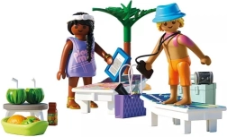 Užijte si letní pohodu s PLAYMOBIL setem pro dva! Lehátka, slunečník, palma, chlazené nápoje a ovoce vytvářejí dokonalou atmosféru na pláži. Mužská figurka má UV citlivý potisk zobrazující spálení sluncem – připomínka, že opalovací krém je nutnost. Praktická plážová taška a chladicí box udrží vše po ruce a v chladu.