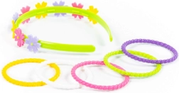 - Zelená čelenka s květinami; náramky v růžové, fialové, žluté, zelené a bílé