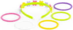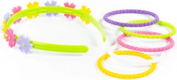 Tato hravá sada doplňků je ideální pro každodenní zdobení i pro dětské hry na salon krásy. Zelená čelenka s květinovými motivy a pět barevných náramků v ladících odstínech umožní dívkám kombinovat styl podle nálady.
