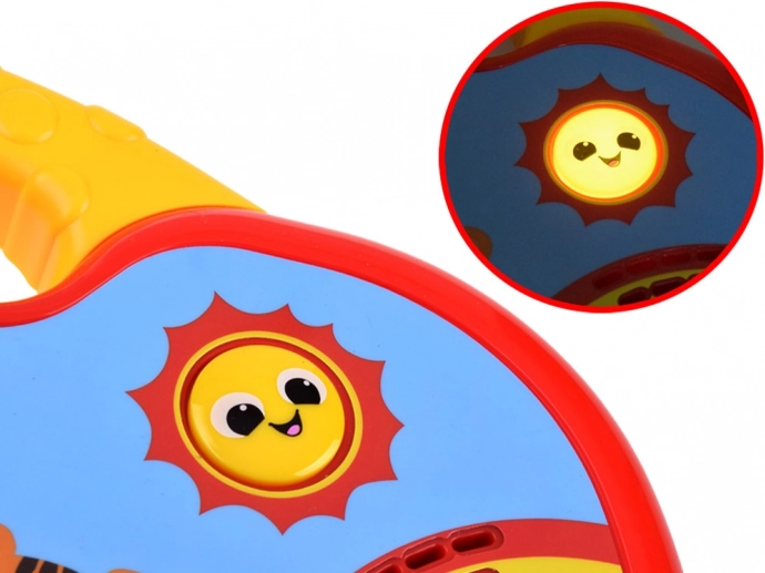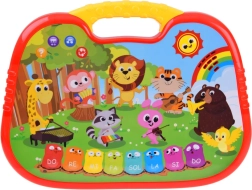 • Přehrávání melodií – každý stisk zahraje další tón známé písničky (např. Old MacDonald, Twinkle Little Star). Výběr skladby mění červené tlačítko se šipkami.