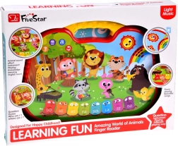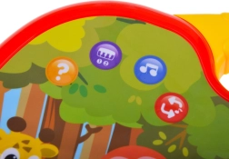 - Učení názvů: po stisku obrázku hračka řekne název zvířátka/nástroje; po stisku červeného tlačítka a znovu obrázku přehraje jejich zvuky.