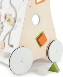 Multifunkční herní panel rozvíjí jemnou motoriku, koordinaci oko–ruka i logické myšlení. Děti si vyzkoušejí první třídění a poznávání tvarů, procvičí obratnost a naučí se základům příčiny a následku.