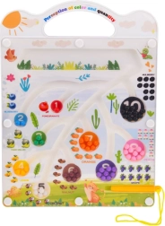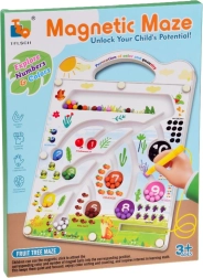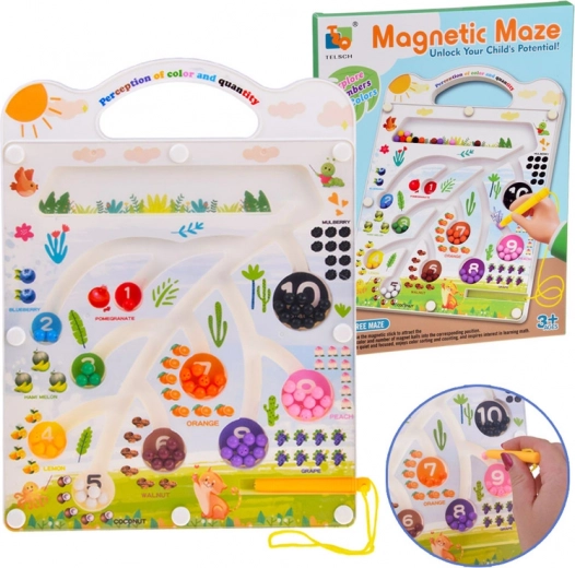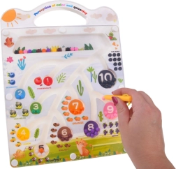 Magnetická tabulka s labyrintem je skvělá didaktická pomůcka pro předškoláky. Barevné kuličky se pomocí magnetického pera vedou drážkami k tematickým otvorům. Děti se při tom učí barvy, první číslice a počítání, rozvíjejí logiku i trpělivost. Díky průhlednému krytu jsou všechny malé dílky bezpečně uvnitř.