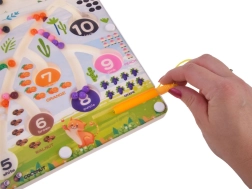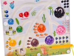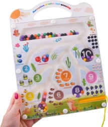 Interaktivní magnetická tabulka s labyrintem podporuje rozvoj dovedností formou hry. Dítě pomocí magnetického pera přesouvá kuličky do správných otvorů, přičemž si procvičuje rozpoznávání barev, počítání do 10 a třídění. Všechny kuličky jsou ukryté pod průhledným krytem, takže se nic neztratí a hračka je bezpečná i pro menší děti.