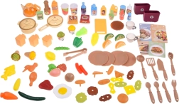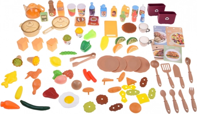 - Bohaté příslušenství – hrnec s poklicí, pánev, konvička, náčiní, nádobí, ovoce, zelenina, maso i dezerty.