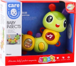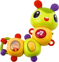 Rozkošná interaktivní housenka pro děti od 18 měsíců přináší světelné LED efekty, veselé melodie a otočné prvky 360°, které podporují zvídavost a jemnou motoriku. Díky různorodým texturám a měkkým gumovým výstupkům slouží také jako úlevné kousátko při prořezávání zoubků. Barevné korálky, chrastítko a obratné „vajíčko“ motivují dítě k objevování a rozvíjejí koordinaci ruka–oko.