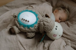 Ovečka svítí příjemným teplým světlem a přehrává melodie i tlumené zvuky přírody pro klidné usínání bez stresu.