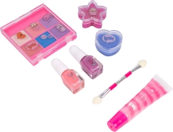 - Kompletní výbava: matné oční stíny, třpytky, rtěnka, lak na nehty, štětce a doplněk.