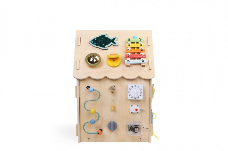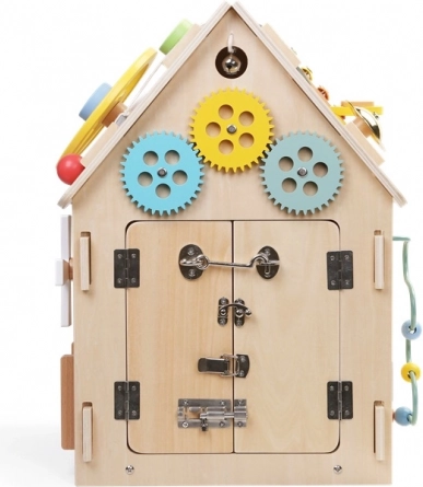 Dřevěný aktivní domeček 2Kids Toys pro děti od 3 let. Volant, labyrint, zámky, počítadlo a další prvky pro rozvoj motoriky a logiky. Bezpečné provedení.