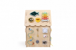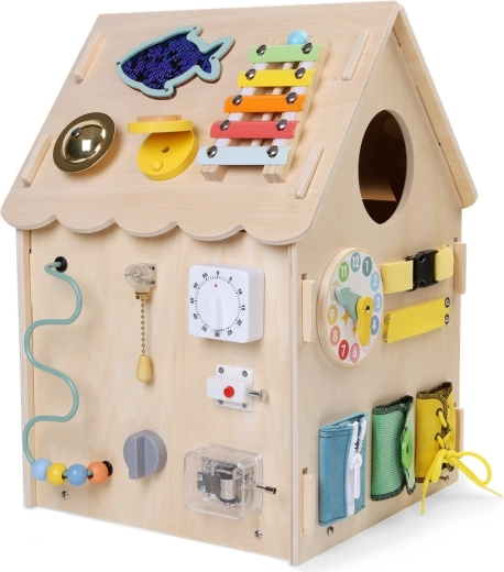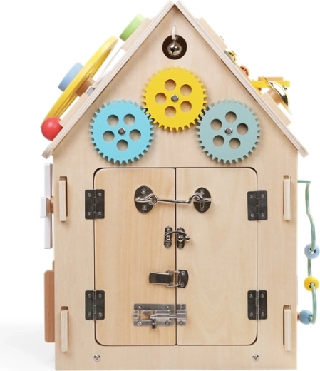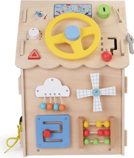 Dřevěný aktivní domeček kombinuje hry a učení v jednom. Nabízí ozubená kolečka, volant a řazení, počítadlo, labyrint, otočný větrník i různé typy zámků a závor pro rozvoj jemné motoriky, logiky a samostatnosti. Vyroben z kvalitního přírodního dřeva s bezpečnými, hladkými hranami a netoxickými barvami. Skvělá volba pro zvídavé děti od 3 let.