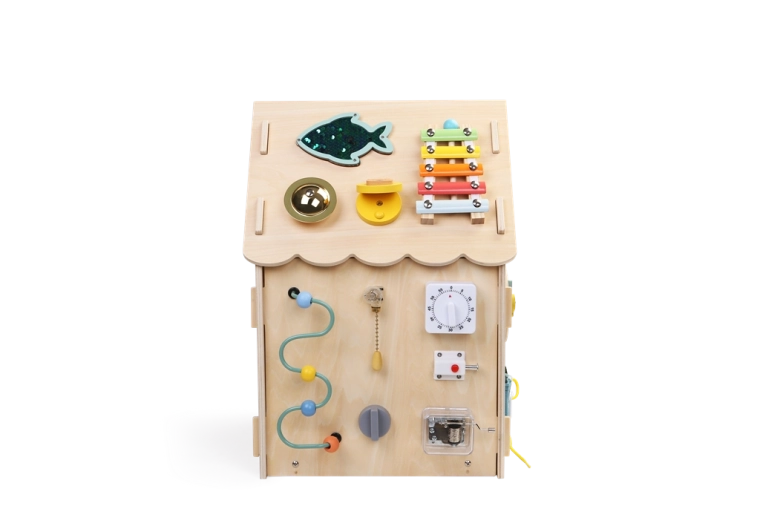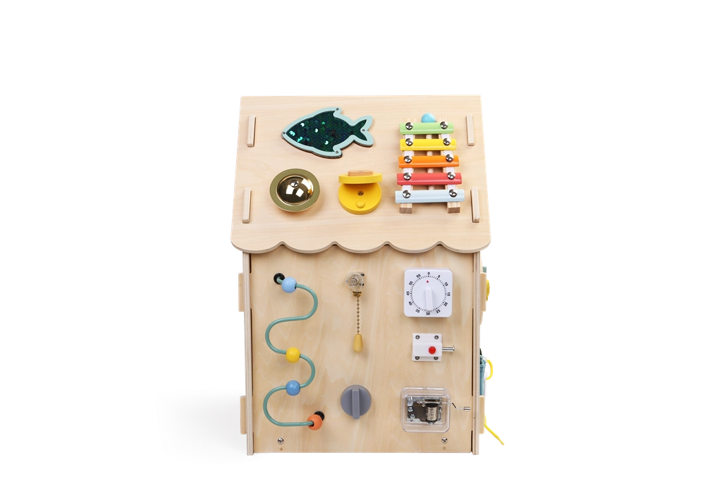 Objevujte svět dovedností s aktivním domečkem, který děti vtáhne do hry na dlouhé hodiny. Každá strana ukrývá nové výzvy: točení volantem a řadicí pákou, proplétání kuličky labyrintem, spojování barevných ozubených koleček, zkoušení zámků, závor a západek nebo zvukové a hmatové podněty díky korálkům a větrníku.