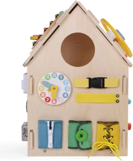 Domeček podporuje soustředění, trpělivost a každodenní dovednosti, jako je zapínání zipu, knoflíku, šněrování či používání přezek. Robustní dřevěná konstrukce, hladké hrany a netoxické barvy zajišťují bezpečné používání.