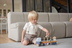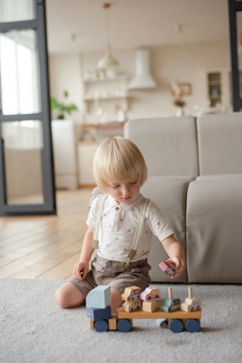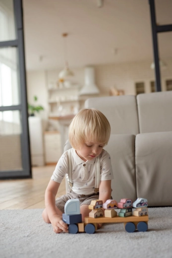 Dřevěná skládačka Cubika v pastelových odstínech potěší děti i rodiče precizním zpracováním z javoru a buku a bezpečnými barvami na vodní bázi. Díly se snadno uchopují a skládají, takže se děti přirozeně učí koordinaci a trpělivosti. Kamion o délce 32 cm pohodlně odveze všech 8 malých autíček.