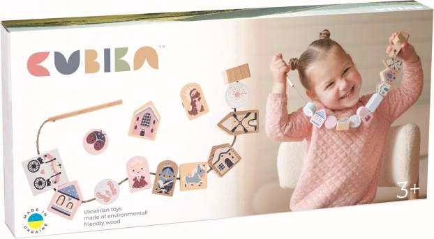 Navlékací pohádka CUBIKA Pastel je kreativní sada pro děti, které milují tvořit a objevovat. Díky 12 dřevěným dílkům s pohádkovými motivy a 8 předlohám děti trénují paměť, koordinaci oko–ruka a koncentraci. Tkanička s dřevěným kolíčkem usnadňuje provlékání a přináší dětem radost z vlastní tvorby.