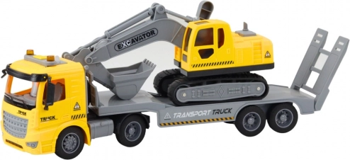 Nákladní auto s plošinou a pásovým bagrem se světly a zvuky. Odpojitelná plošina, odolný plast, baterie v balení. Skvělý dárek pro malé stavitele.