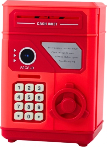 Zábavný a bezpečný způsob, jak děti naučit hospodařit s penězi: elektronická skarbonka se sejfovým zamykáním a PIN kódem, realistickou klávesnicí a automatickým vtažením bankovek. Červený sejf z odolného plastu zvládne drobné úspory i bankovky, nabízí snadnou změnu hesla a kreativní samolepku imitující Face ID pro ještě větší zábavu.