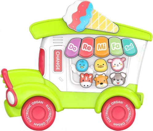 Roztomilé dětské piánko ve tvaru barevné zmrzlinárny na kolečkách potěší každého malého hudebníka. Nabízí klávesy s tóny „Do Re Mi Fa Sol“, zvířátkové a smajlíkové tlačítka a mnoho melodií a efektů. Díky bezpečnému provedení a sytým barvám je ideální pro první hudební krůčky. Podporuje sluch a rytmus, jemnou motoriku a kreativní hru.