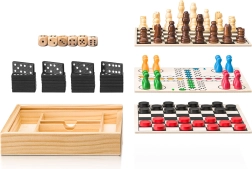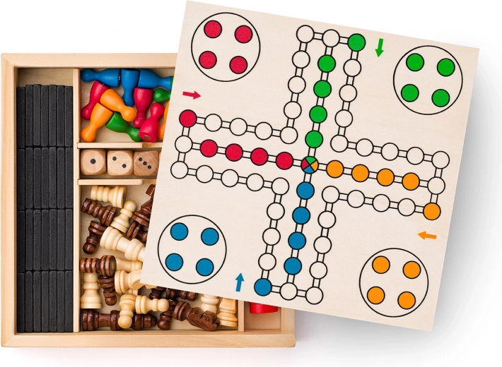 Tento elegantní set spojuje oblíbené společenské hry do jednoho praktického balení. Dřevěné provedení a magnetické dílky zajišťují pohodlné hraní bez posouvání figurek, a to i na cestách. Kompaktní rozměry usnadňují skladování i přenášení.